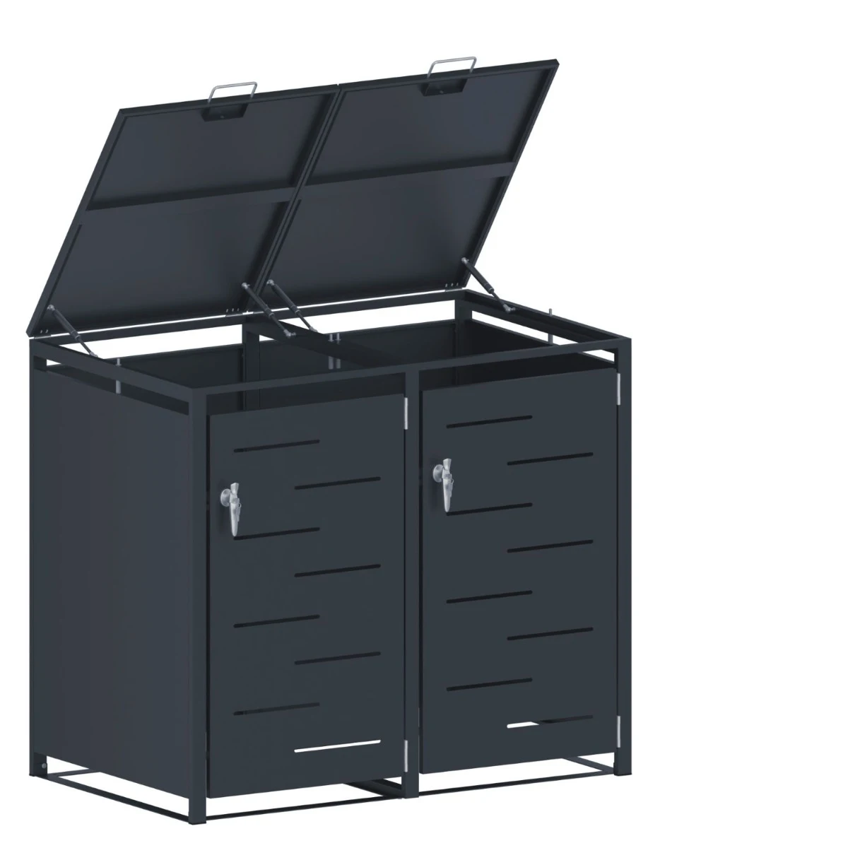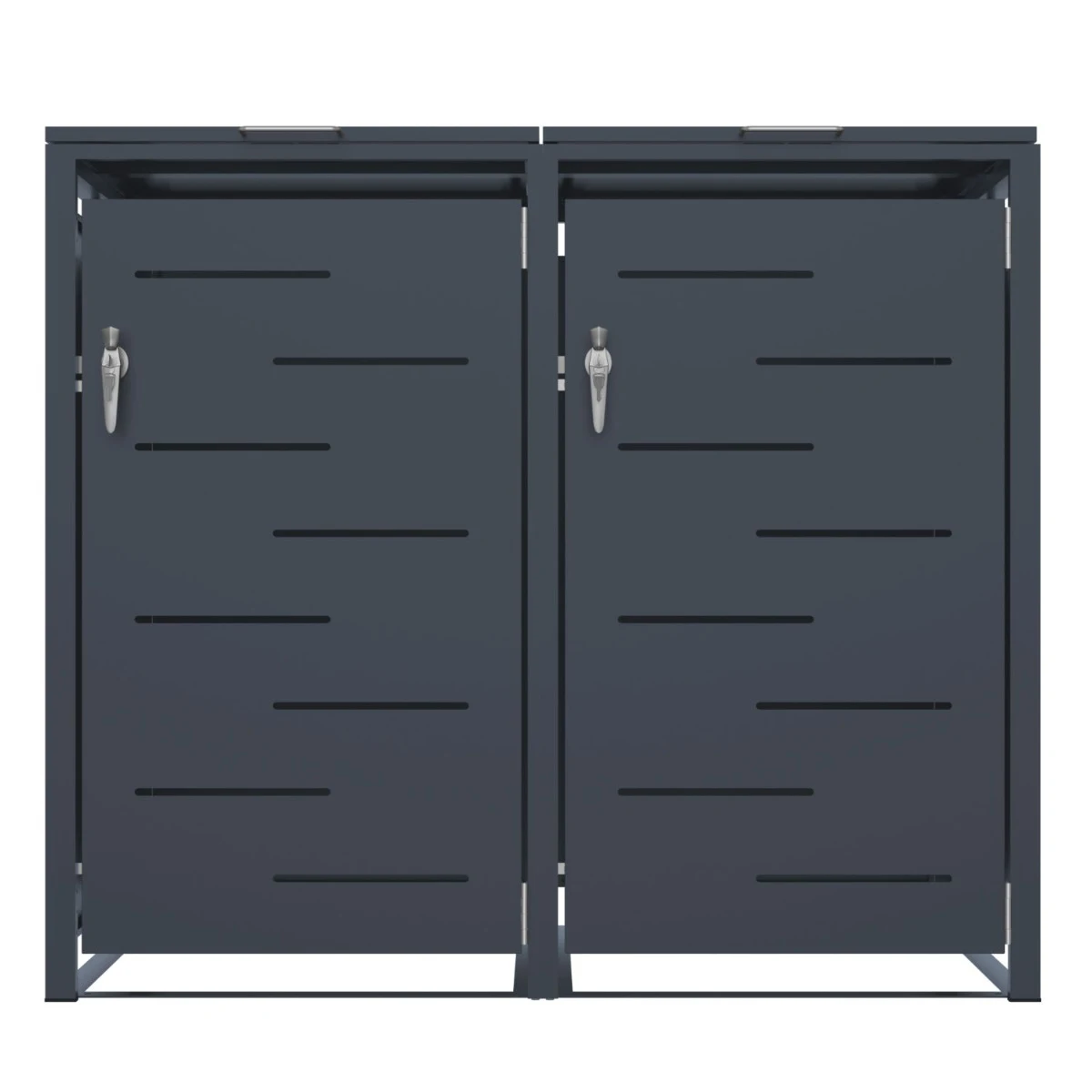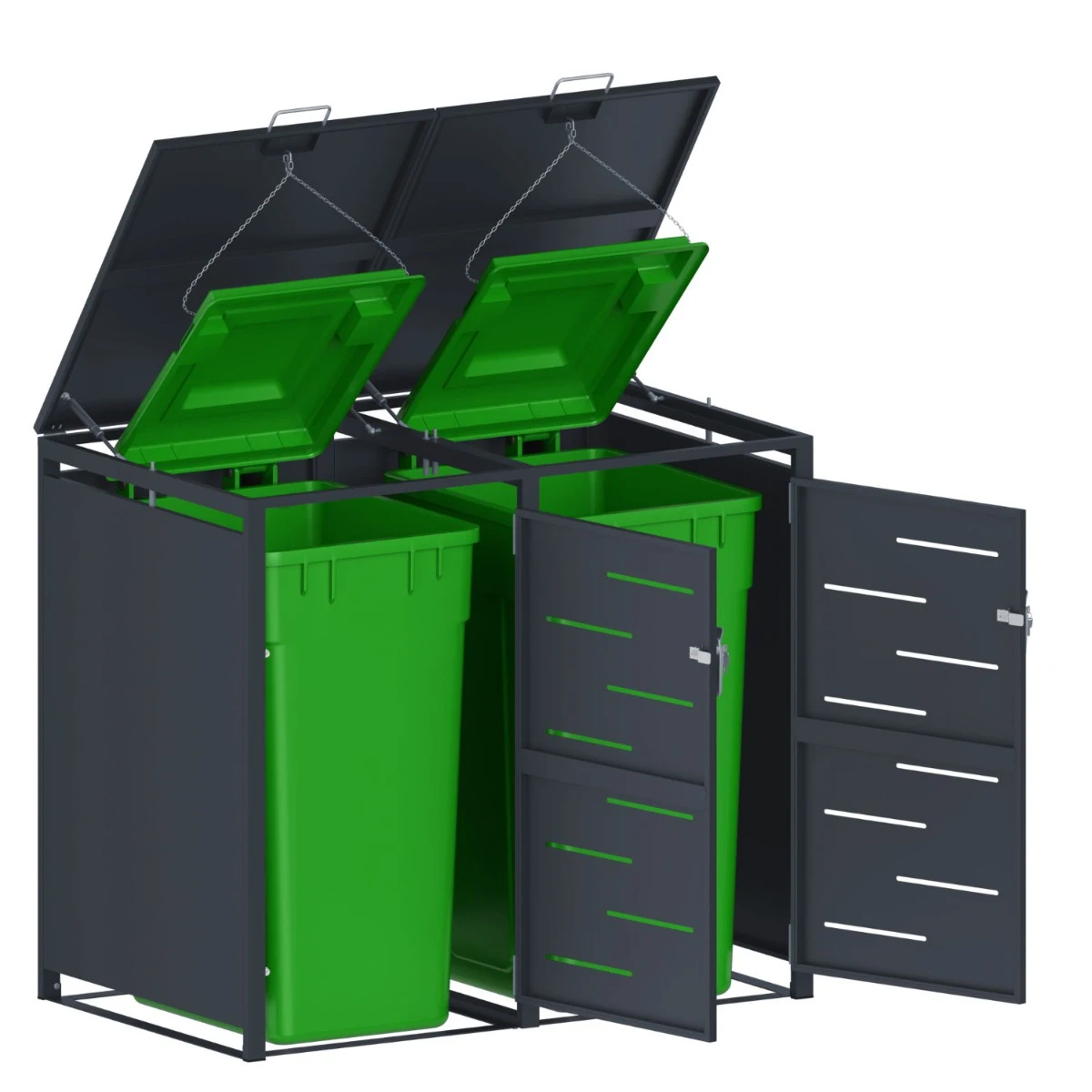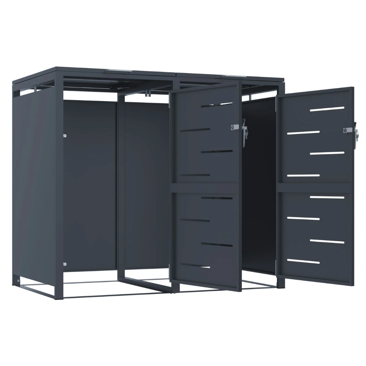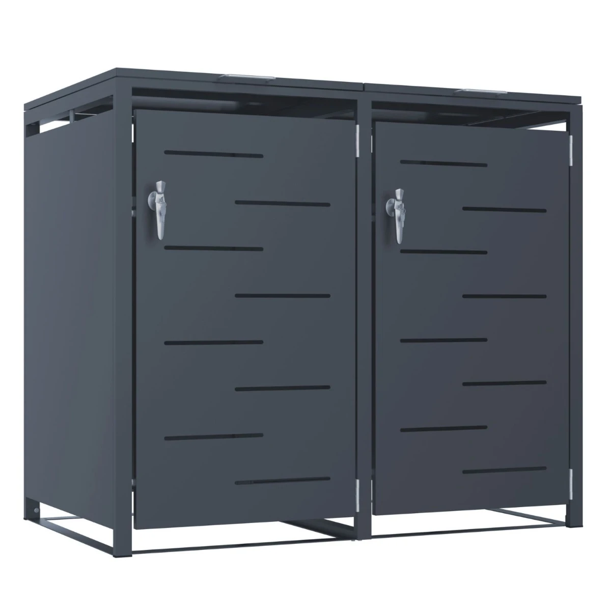 Magazia pentru depozitare pubele CCG-02 este o solutie practica si bine construita pentru mascarea a doua pubele de 240 L. Este realizata din metal rezistent, tratat pentru utilizare in exterior, astfel incat sa faca fata fara probleme ploii, vantului si variatiilor de temperatura. Dimensiunile generoase (134 x 80 x 116 cm) permit depozitarea ordonata a recipientelor, fara improvizatii.